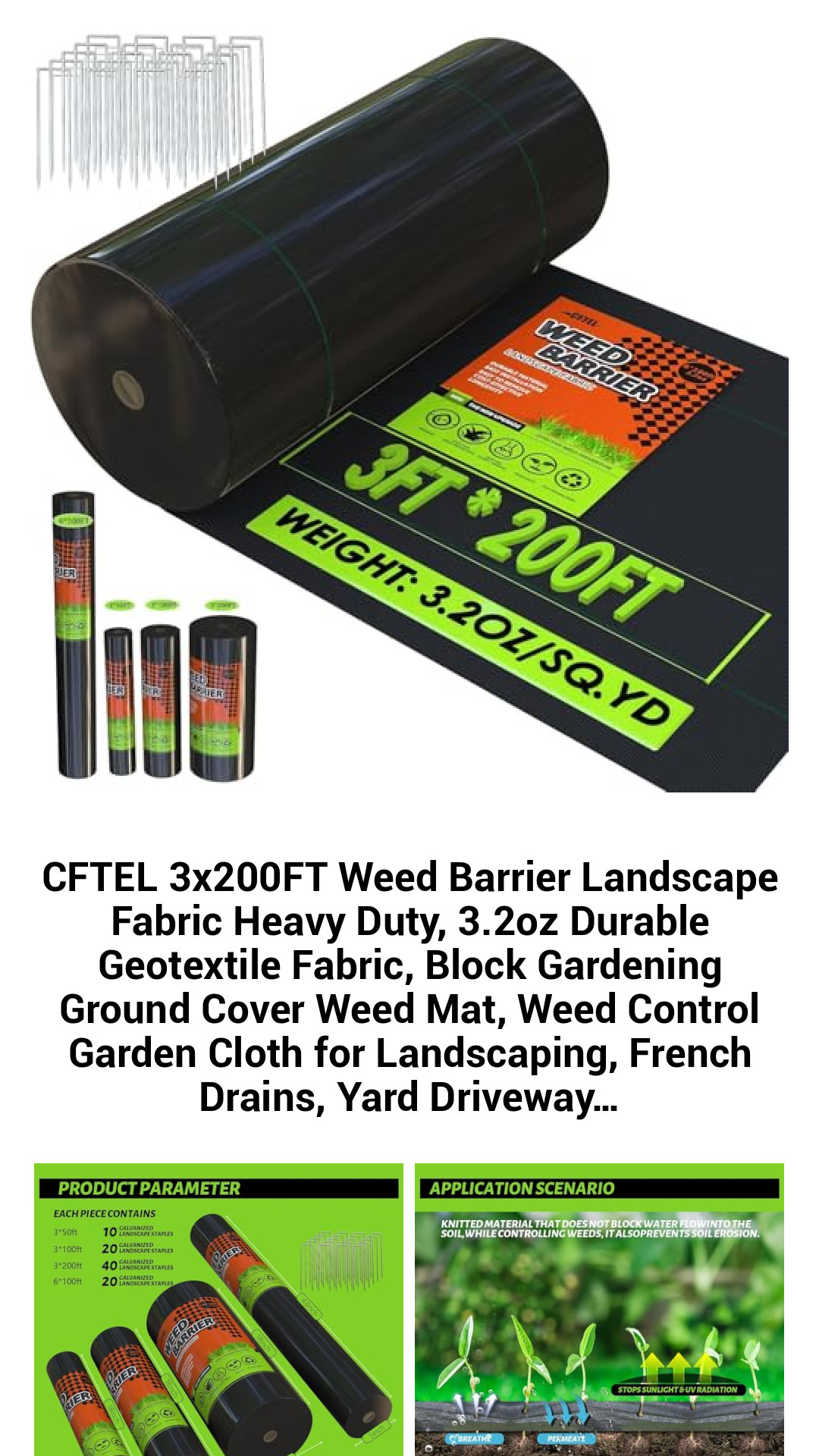 - ?1. CFTEL Weed Barrier Fabric?:Weed barrier landscape fabric is a type of geotextile fabric that is commonly used in landscaping and construction garden Fabric,mulch for landscaping. With excellent weed control properties, it can effectively protect the garden ecosystem and make your plants grow safely and healthily.