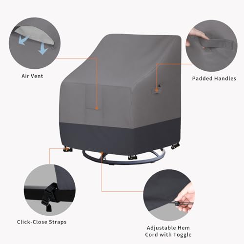 - Premium Quality: The outdoor swivel chair cover is made of heavy duty oxford fabric coated PVC back, very durable and scratch-resistant. The fabric is processed with waterproof treatment, can be 100% waterproof and the water won't seep into the cover on rainy days.
