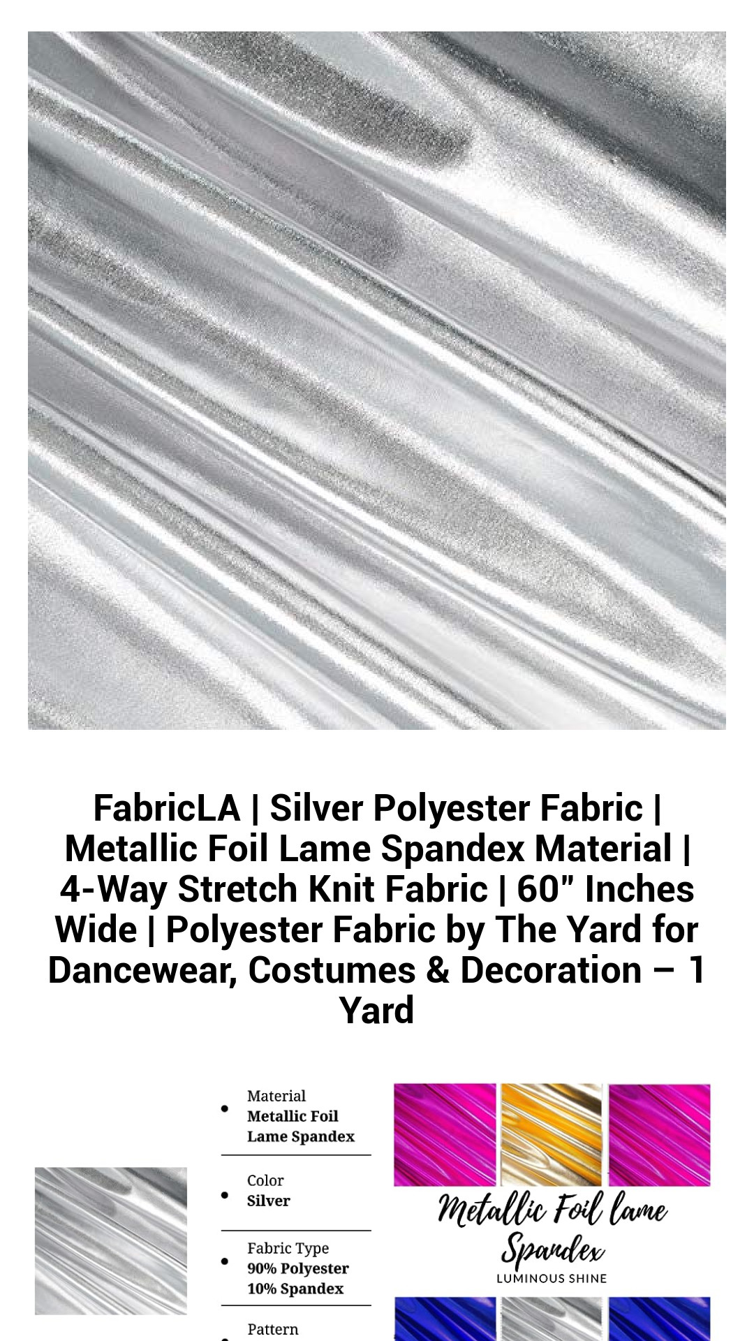 FabricLA | Silver Polyester Fabric | Metallic Foil Lame Spandex Material | 4-Way Stretch Knit Fabric | 60" Inches Wide | Polyester Fabric by The Yard for Dancewear, Costumes & Decoration – 1 Yard